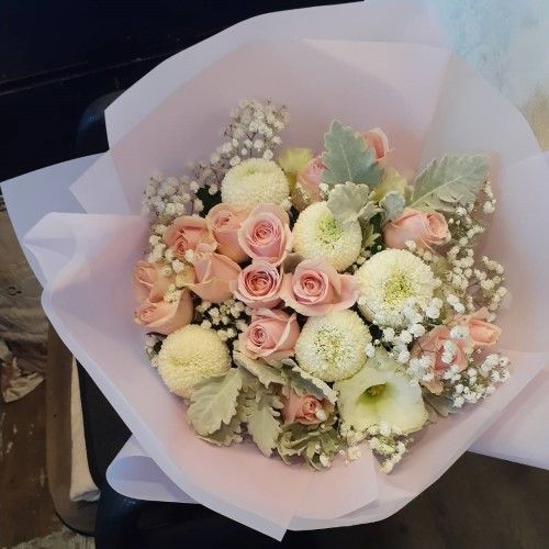 花材 粉玫瑰 白乒乓 滿天星 銀葉菊